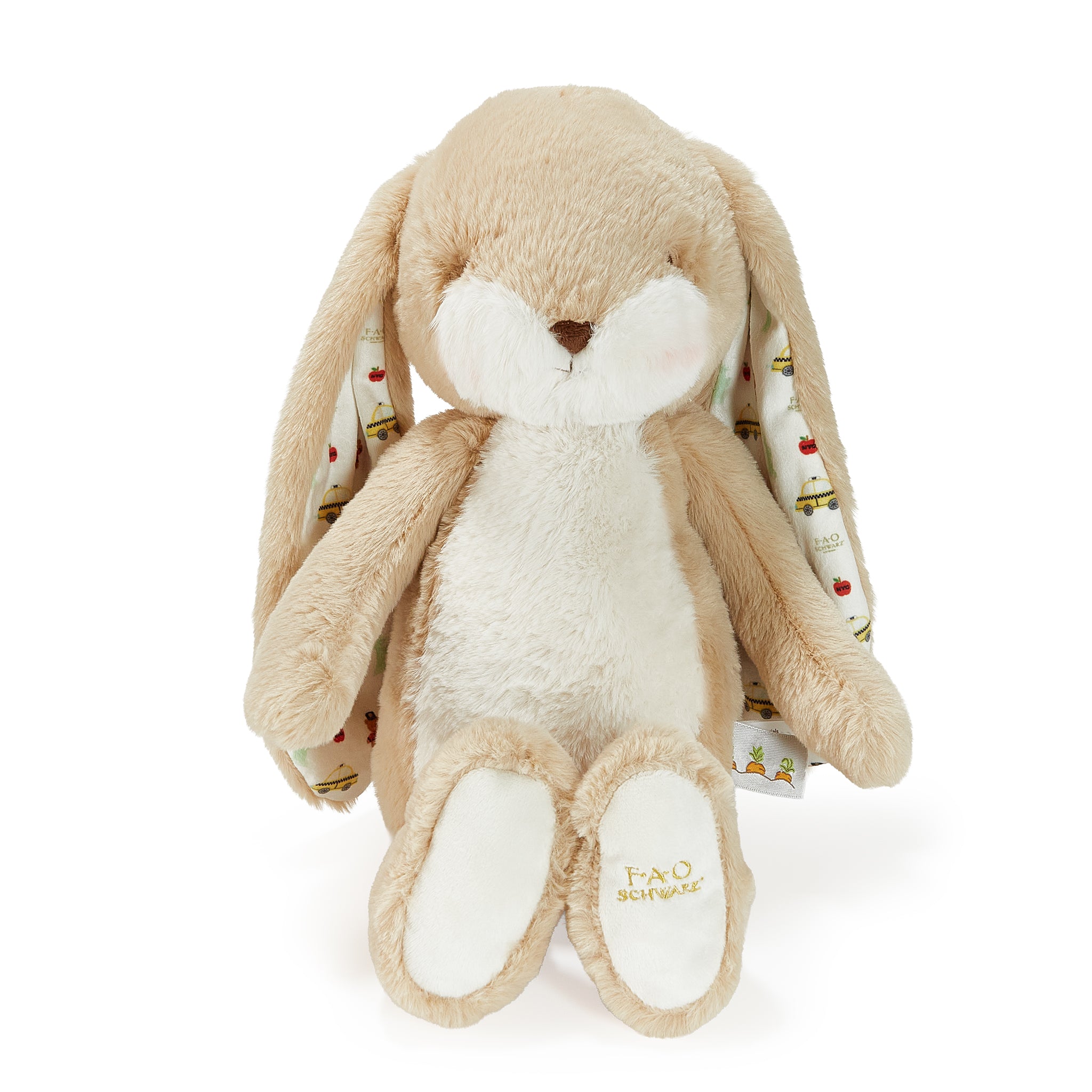 The ears are lined with our exclusive New York City print velour. featuring the iconic FAO Schwarz Bear. yellow taxi. Statue of Liberty. and a classic red apple — a true celebration of the city that never sleeps. Bring home a little NYC magic and make every hug a moment to remember.